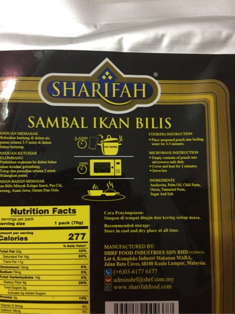 Sambal Ikan Bilis saiz hidangan 2 sudu besar atau bersamaan 30 gram. Bagaimana nak membakar 90 kalori. Servings Per Container 30.